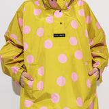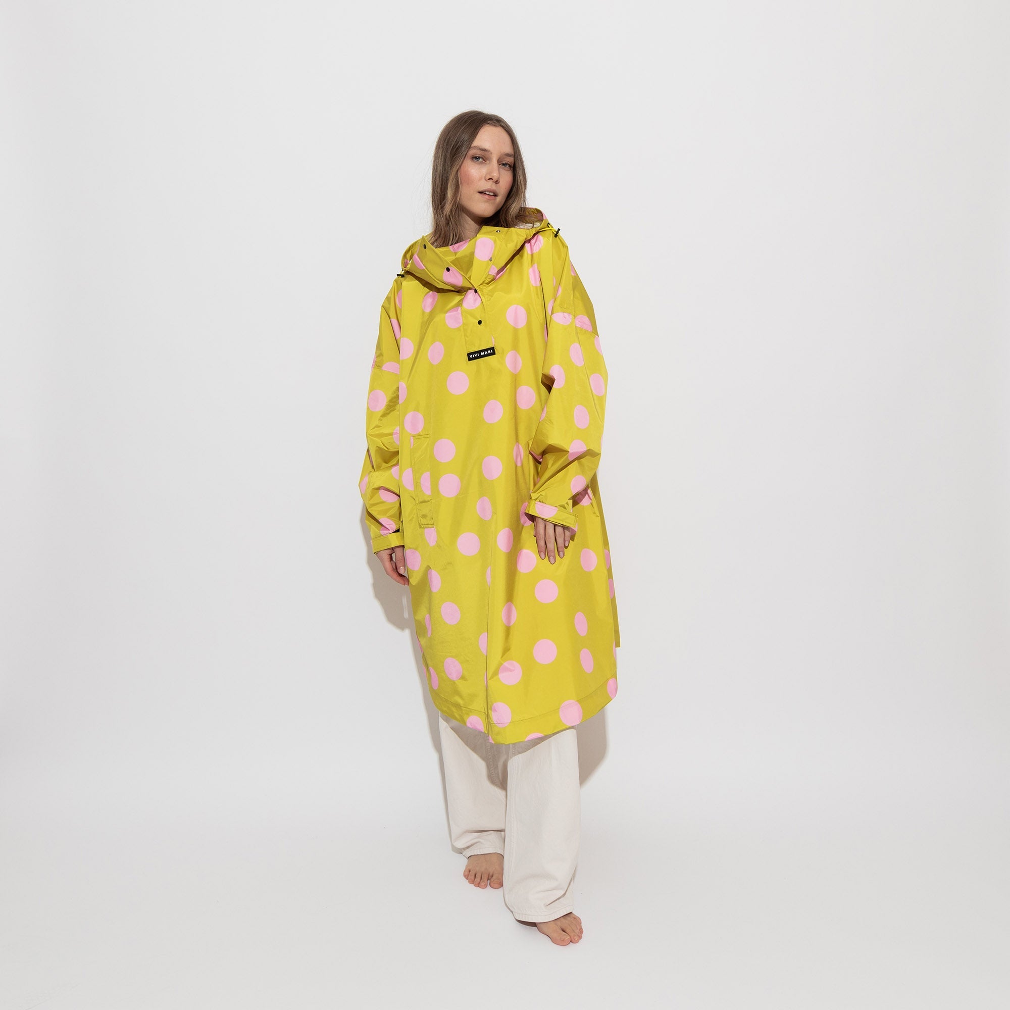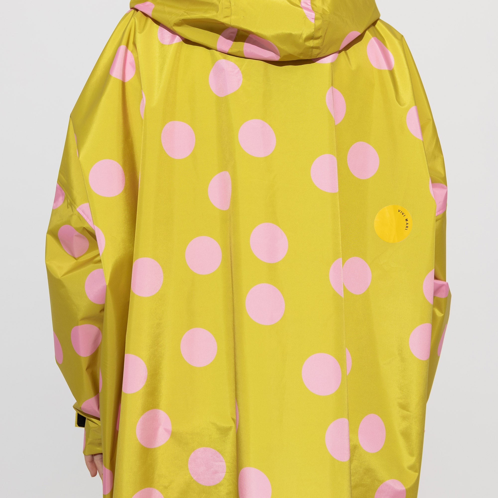 Saca el máximo partido a los días lluviosos con nuestro chubasquero urbano de corte oversize. El chubasquero está confeccionado con materias primas recicladas y es impermeable. La capa con el look de lunares VIVI MARI en color citrus/rosé te protege de la humedad y también se puede llevar de forma flexible sobre una cálida chaqueta de invierno en los días fríos.
