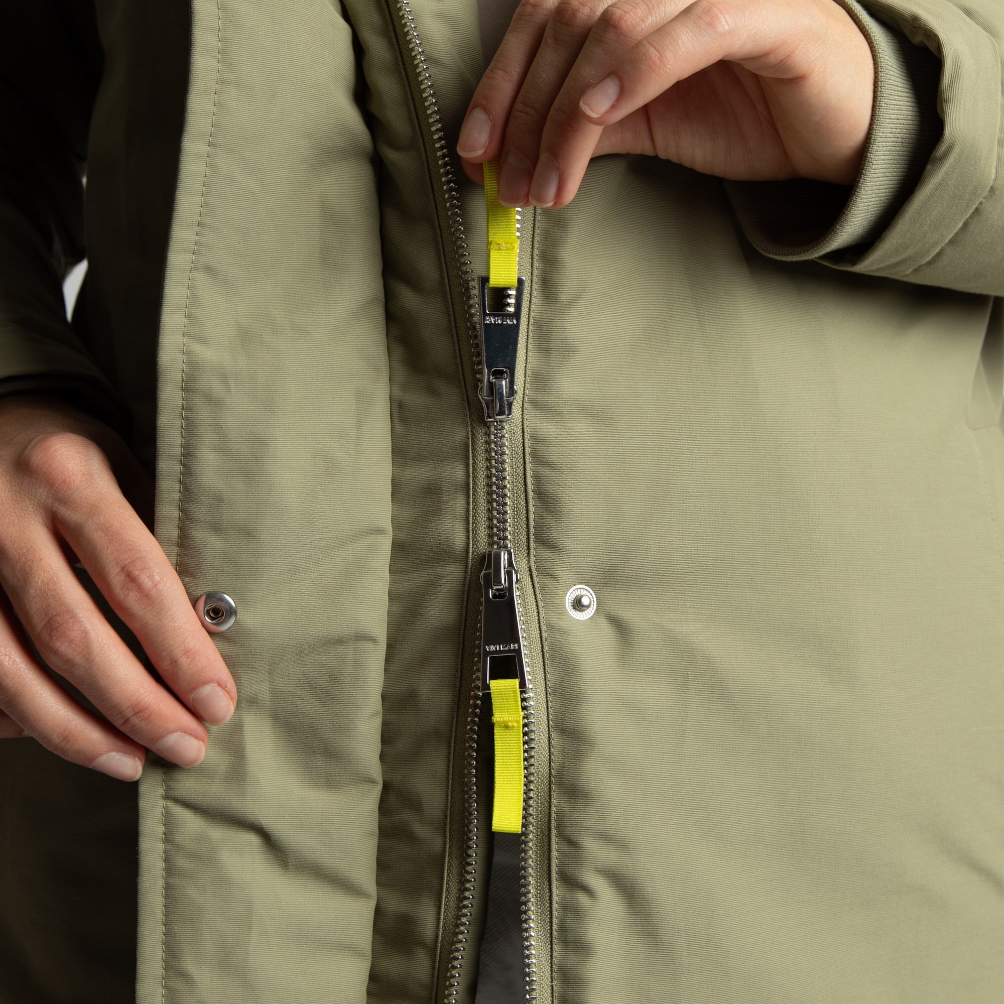 Bei der Entwicklung des Parkas stand die Verarbeitung der besten Materialien im Fokus: Der Hauptstoff besteht aus einem Baumwoll-Polyamid Gewebe, das Futter aus reinem Polyamid.